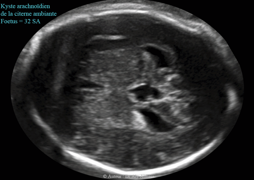 Les kystes arachnoïdiens sont des formations kystiques bénignes à paroi fine, sans vascularisation en Doppler couleur ; contenant du liquide céphalo-rachidien, pour cette raison, ils apparaissent à l'échographie comme des formations kystiques intra-cérébrales anéchogènes ; habituellement uniques, uniloculaires, mais parfois polylobées (polyloculaires) ou multiples ; de taille très variable, parfois très volumineux ; primitifs (malformation de la méninge primitive) ou secondaires (acquis) suite à une infection cérébrale, un traumatisme ou une hémorragie (enkystement du liquide céphalo-rachidien dans des adhérences arachnoïdienne).
