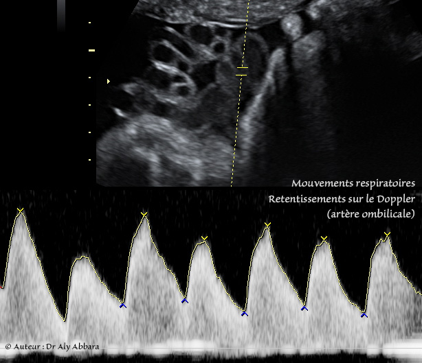 L'analyse spectrale du Doppler de la circulation artérielle fœtale montre que les mouvements respiratoires se manifeste par une irrégularité de la hauteur des pics systoliques et diastoliques en rapport avec les modifications de la pression dans la cage thoracique.