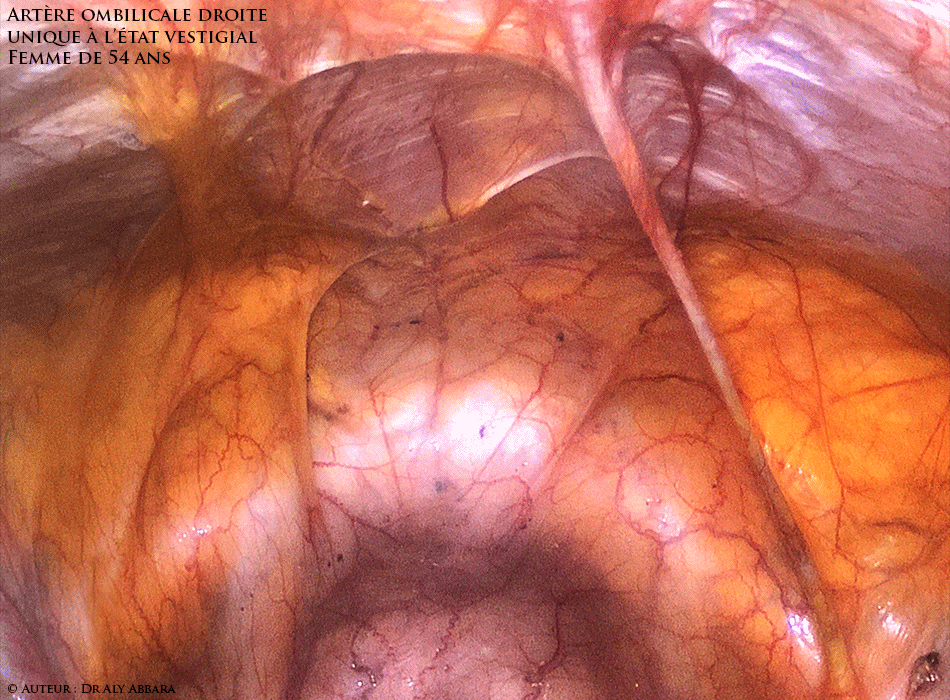 - Image clinique cœlioscopique animée mettant en évidence la présence d'une artère ombilicale unique (AOU) droite à l'état vestigial, dans sa portion pariétale antérieure sous ombilicale. Cette AOU apparaît sous forme d'un repli péritonéal paramédiane droit renfermant l’artère ombilcale vestigiale.