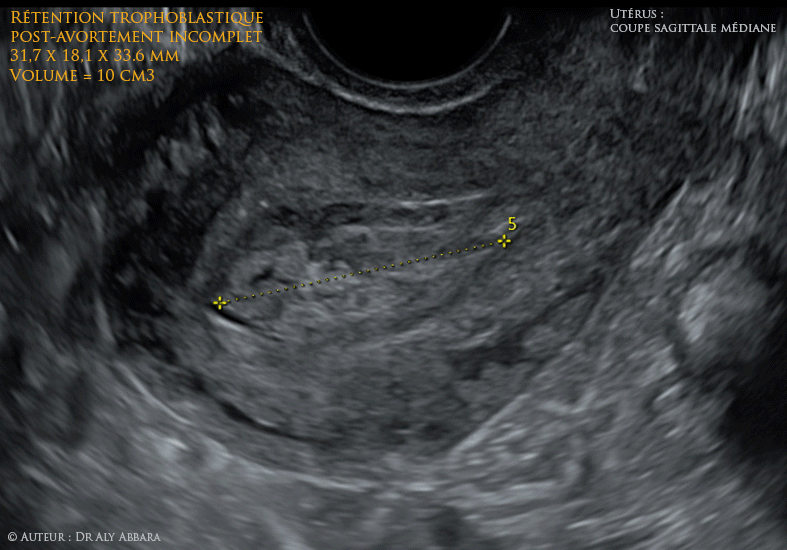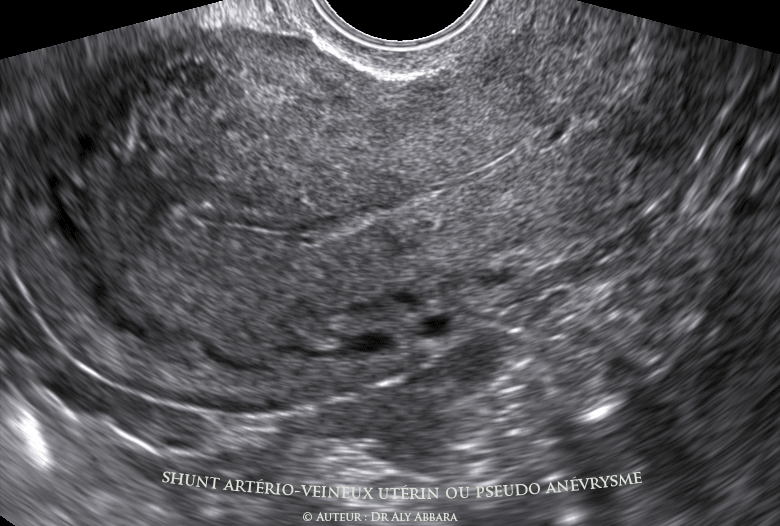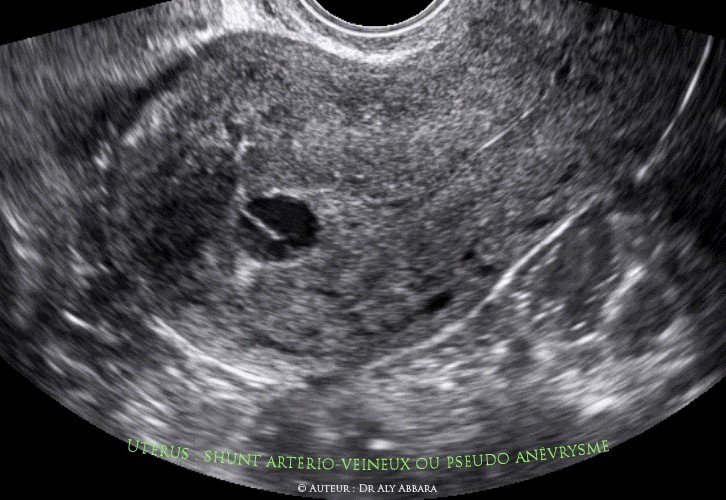 - Anomalie vasculaire utérine de type " shunt artério-veineux ou pseudo anévrysme " mis en évidence deux semaines après une révision utérine (par simple aspiration) pour rétention trophoblastique de 10 cm3 suite à un avortement incomplet (6 semaines auparavant) d'une grossesse de 8 SA.