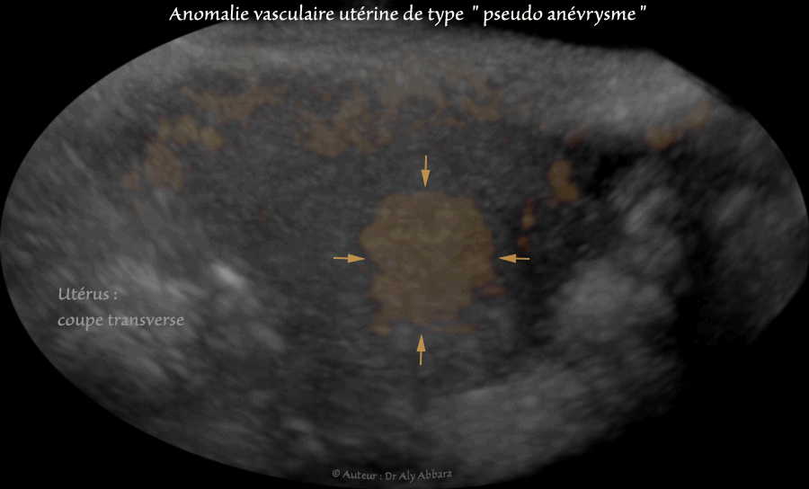 - L'échographie met en évidence la présence, au sein de la paroi postéro-fundique de l'utérus, d'une lacune hypoéchogène à contour irrégulier. Le Doppler couleur montre qu'il s'agit d'une pathologie vasculaire débutant dans la cavité utérine et traversant verticalement les deux tiers de l'épaisseur myométriale profonde.