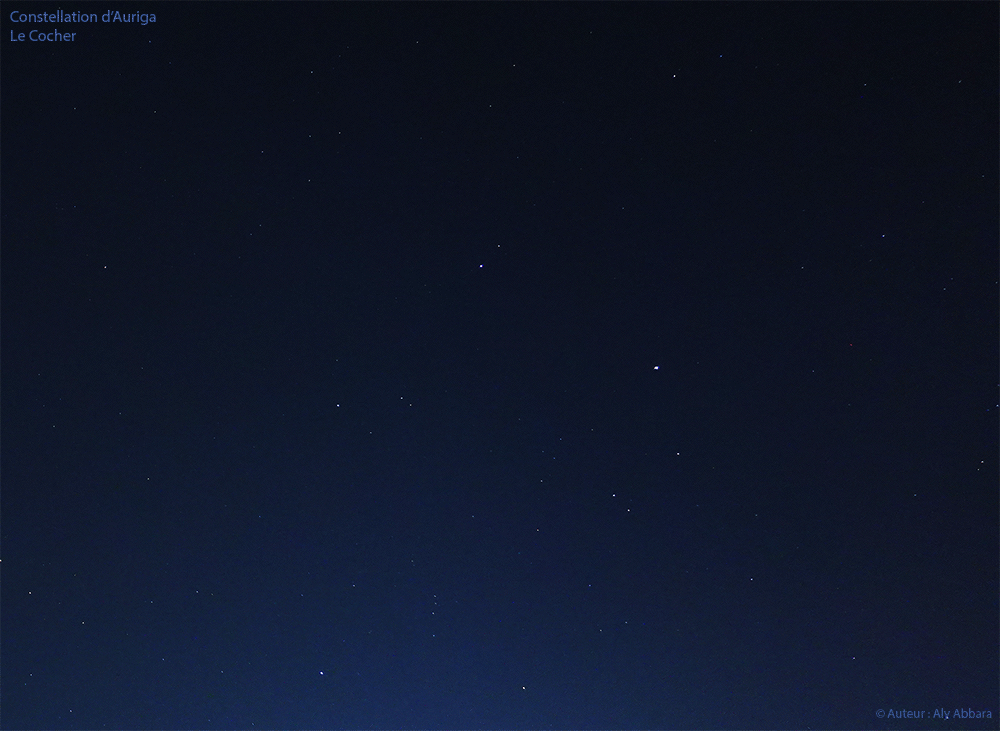 La constellation du Cocher prend la forme d'un pentagone que l'étoile Capella détermine son apex. Elle se situe près de la Voie lactée.