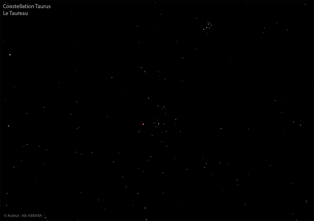 - α Tauri : Aldébaran, une étoile rouge géante à l'emplacement de l’œil droit du Taureau ; elle constitue la 4e maison (station) de la lune.