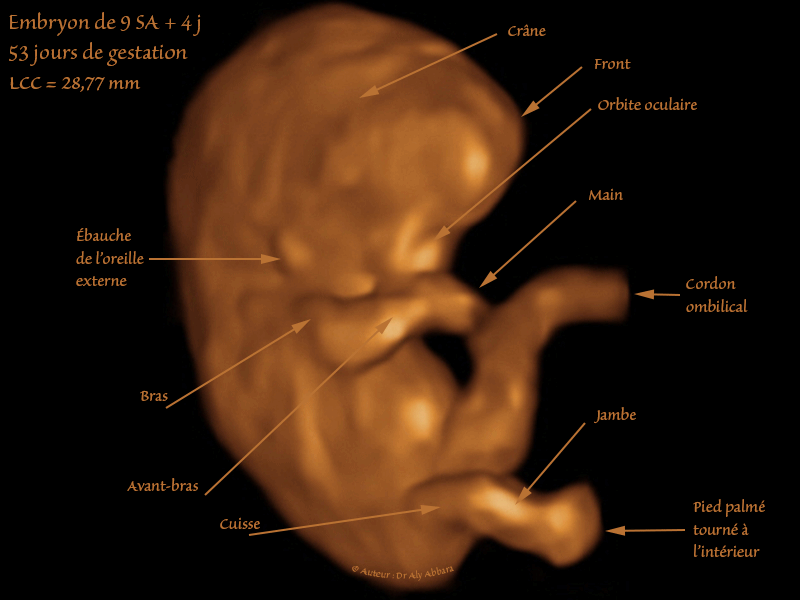 - le pôle céphalique : la voûte crânienne ; le front ; les orbites oculaires et latéralement, les ébauches des oreilles externes