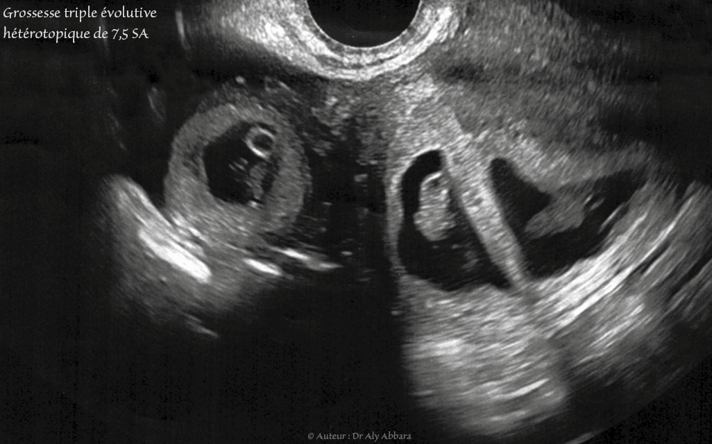- Images échographiques par voie endovaginale mettant en évidence la présence d'une grossesse triple hétérotopique évolutive de 7,5 SA ; elle est composée de deux éléments bien distingues :
