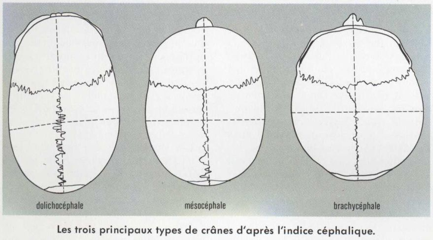 Les anthropologues classent les crânes humains selon la valeur de l'indice céphalique en trois catégories : dolichocéphales, mésocéphales et brachycéphales ; les valeurs les plus courantes :
