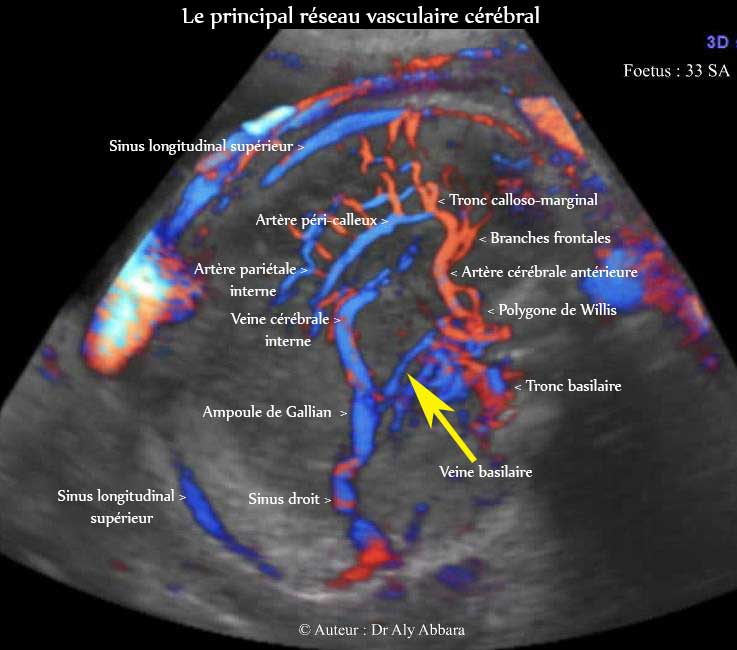 Images échographiques montrant le réseau vasculaire artério-veineux principal du cerveau fœtal