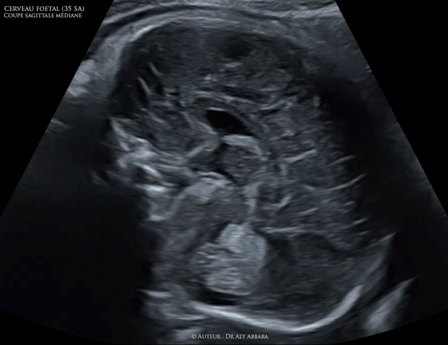 Séquences vidéo et images échographiques montrant les structures anatomiques identifiables dans une coupe sagittale médiane rasant la face interne de l'un des deux hémisphères du cerveau fœtal à 35 SA du haut vers le bas :