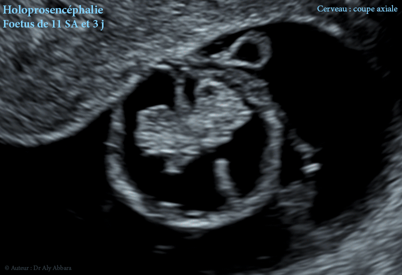 - Au cours du premier trimestre de la grossesse, entre 11 et 14 SA, les deux plexus choroïdes normaux occupent largement les deux ventricules latéraux et composent ensemble une forme ressemblant à un papillon "signe du papillon - Butterfly sign" ; ce signe est absent dans l'holoprosencéphalie alobaire.