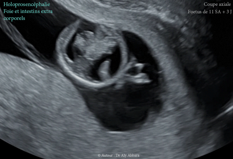 - Ce fœtus présente d'autres anomalies (syndrome polymalformatif), en particulier, une célosomie (défaut de la fermeture la paroi abdominale ventrale) avec l'extériorisation complète du foie hors de la cavité abdominal et une laparoschisis (intestins grêles en position extra-abdominle).