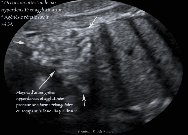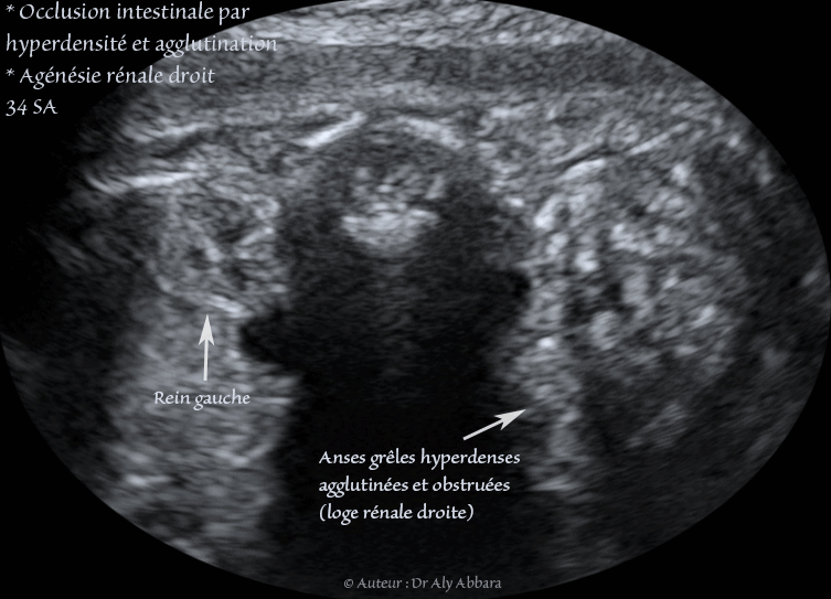 Il s'agit d'une fœtus de 34 SA ; après sa naissance à 38 SA, cette occlusion des anses grêles a nécessité deux interventions chirurgicales digestives dans la période néonatale.