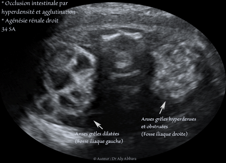 إنسداد الأمعاء الدقيقة عند جنين بعمر 34 أسبوع اِنقطاع طمث ؛ إنه عائد إلى وجود مجموعة من العرى المعوية الدقيقة المتلاحمة ببعضها البعض والمسدودة اللمعة بسبب الكثافة الشديدة لمحتوياتها المخاطية والإفرازية