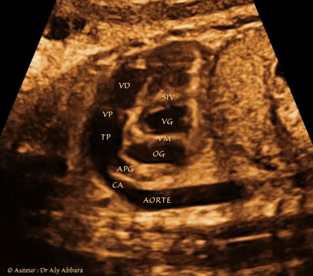 Le ventricule droit (VD) ; la voie d'éjection du ventricule droit ; la valve pulmonaire (VP) et ensuite le tronc pulmonaire (TP) qui se divise sur cette coupe en deux branches : l'artère pulmonaire gauche (APG) et le canal artériel qui permet au tronc pulmonaire de se connecter à la crosse de l'aorte à proximité de l'aorte descendante.