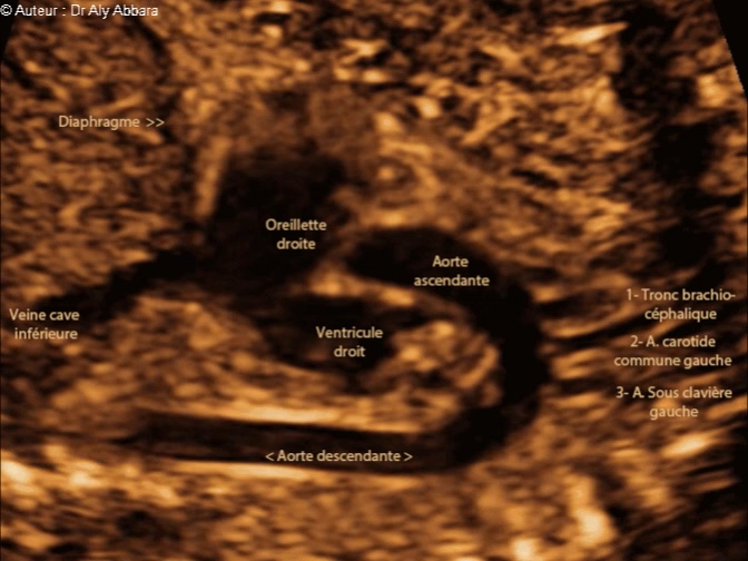 Images échographiques montrant l'aorte dès son départ du ventricule gauche puis : la crosse de l'aorte avec ses trois branches (le brachio-céphalique, l'artère carotide commune gauche et l'artère sous clavière gauche) et enfin, l'aorte descendante.