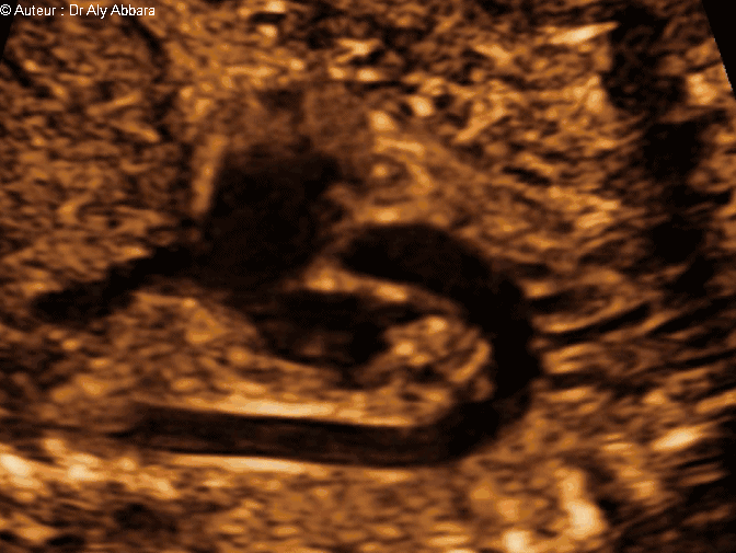 Sur cette image animée on identifie également la partie terminale de la veine cave inférieure se terminant dans l'oreillette droite, puis une vue partielle de la valve tricuspide et le ventricule droit.