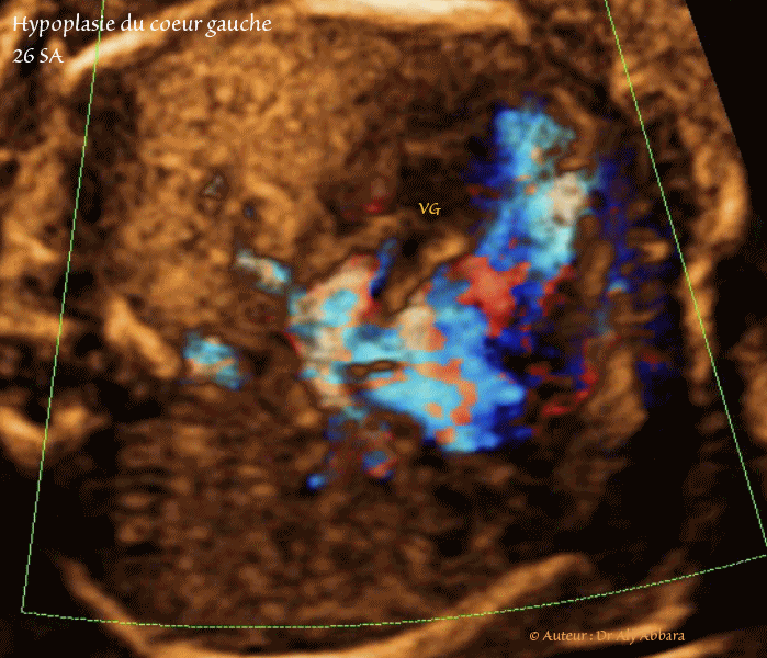 - Hypoplasie sévère du ventricule gauche : il s'agit d'un ventricule globuleux ; ses parois sont hyper-échogènes par un phénomène de fibro-élastose touchant l'endocarde.