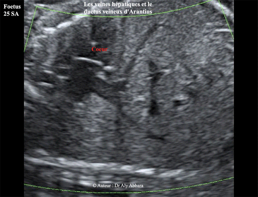 Images échographiques montrant les trois veines hépatiques et leurs rapports anatomiques avec le ductus veineux (canal veineux), branche de la veine ombilicale gauche.