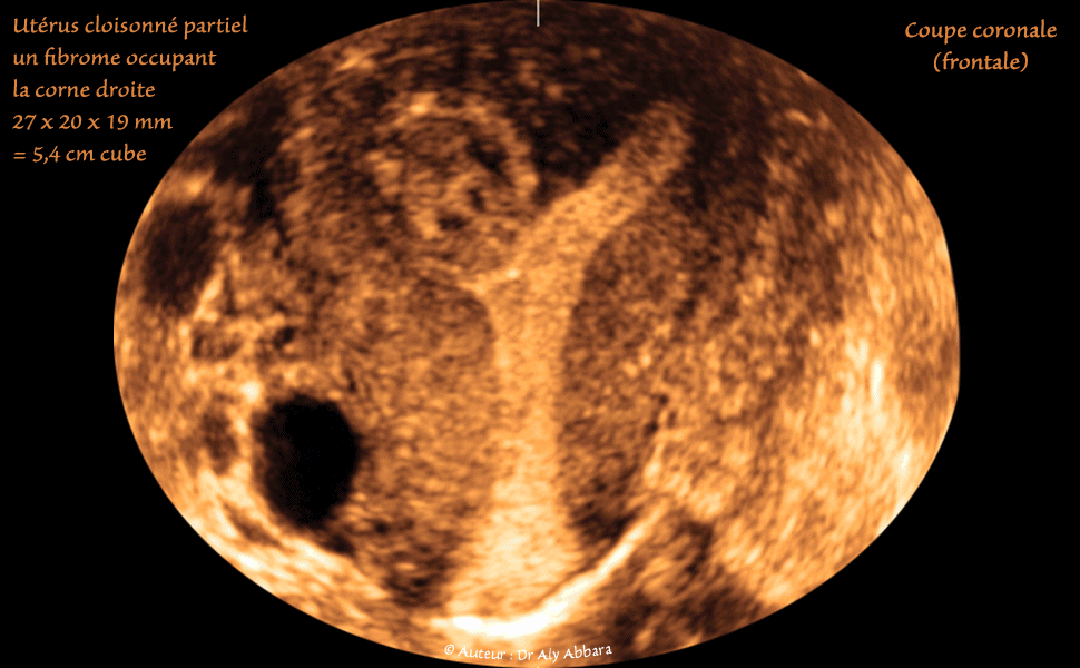 Le compartiment droit de la cavité utérine fundique contient une masse ovale de 27 x 20 x 19 mm de diamètre, soit 5,4 cm3 de volume, il s'agit d'un vieux myome asymptomatique partiellement calcifié (histologiquement confirmé), sous muqueux (classe 0 selon le FIGO).