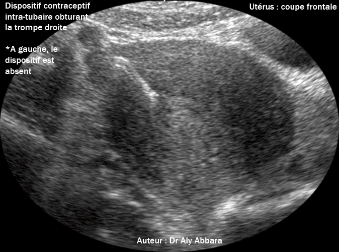 L'aspect échographique du dispositif contraceptif intra-tubaire qui fut introduit dans la trompe deux ans auparavant. Il s'agit d'une coupe frontale de l'utérus mettant en évidence le fond utérin. On remarque la disparition du dispositif intra-tubaire du côté gauche. |