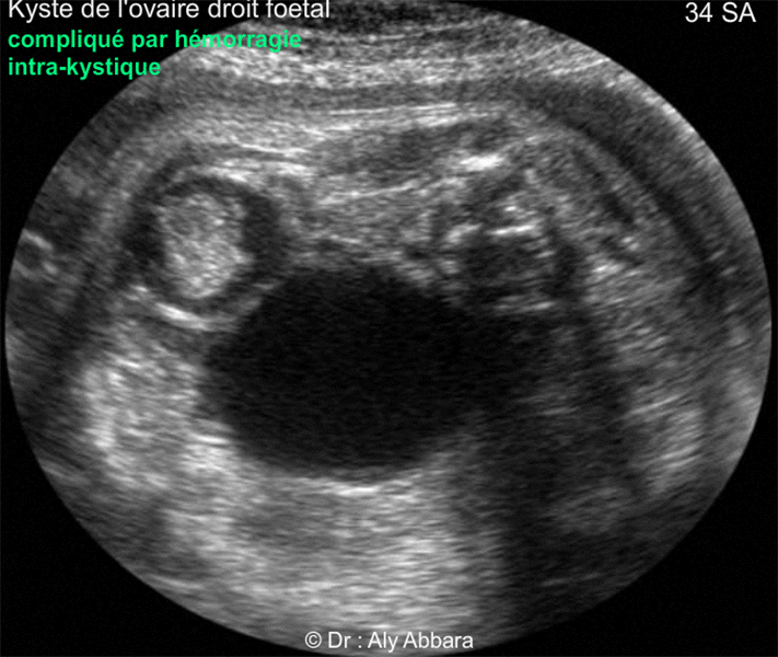 | L'hémorragie intrakystique du kyste de l'ovaire fœtal se manifeste par le changement de son aspect, il augmente de volume et son contenu devient hétéro-échogène, avec parfois la présence caillots sanguins rétractiles et la formation d'échos déclives, c'est-à-dire de niveau fluide-fluide par la déposition de caillots sanguins au fond du kyste. Quand l'hémorragie intra-kystique est importante, le kyste prend l'aspect d'un hématome solide et organisé L'hémorragie intrakystique est souvent secondaire, suite à une torsion ovarienne. |