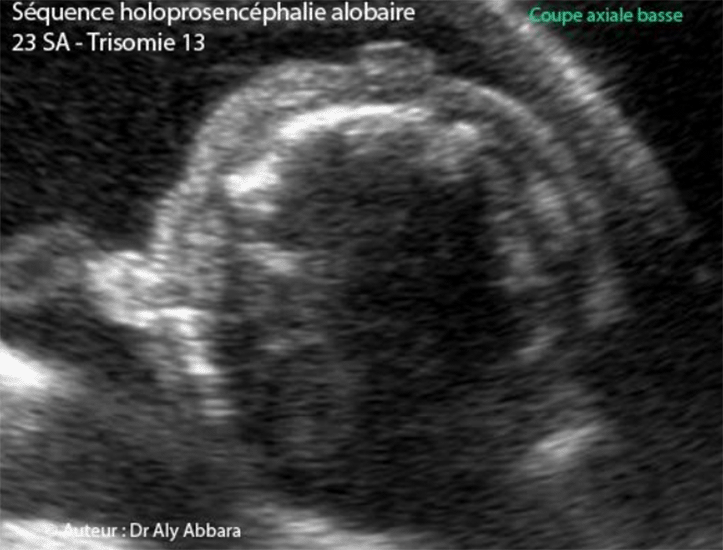 Images échographiques montrant, dans le cadre d'une holoprosencéphalie alobaire et trisomie 13, sur des coupes axiales du pôle céphalique fœtal, la présence d'une hypoplasie du pavillon de l'oreille externe et d'un proboscis. Le profil fœtal met bien en évidence la présence du proboscis frontal (au dessus du globe oculaire médiane unique), puis l'arhinie. Dans le cas présenté dans cet article, le fœtus est trisomique 13 âgé de 23 SA. L'étude de la morphologie révèle la présence d'autres anomalies en dehors de la séquence holoprosencéphalie alobaire avec microcéphalie (périmètre céphalique = 170 mm, soit "-3,24 DS") ; un spina bifida aperta ; un spot blanc intracardiaque ; une hyperéchogénicité intestinale ; une artère ombilicale unique ; main crispée unilatérale et enfin, un retard de croissance in utero modéré et symétrique. Mise à jour : le 1 Décembre, 2020 |