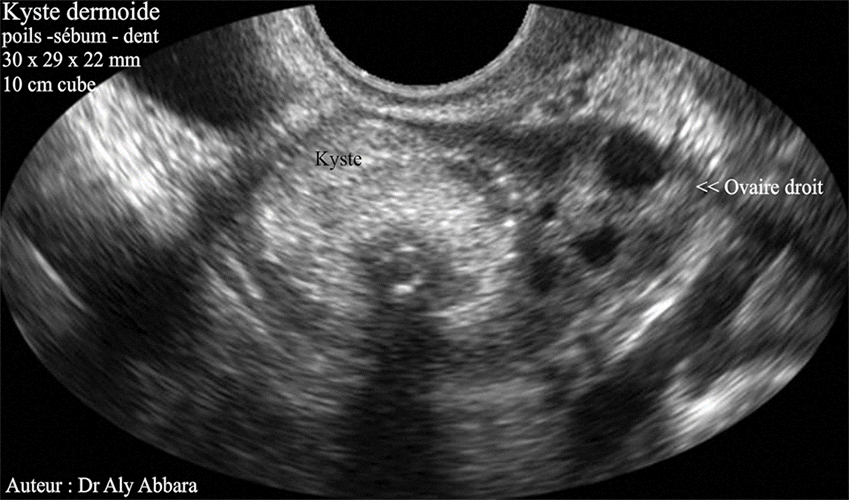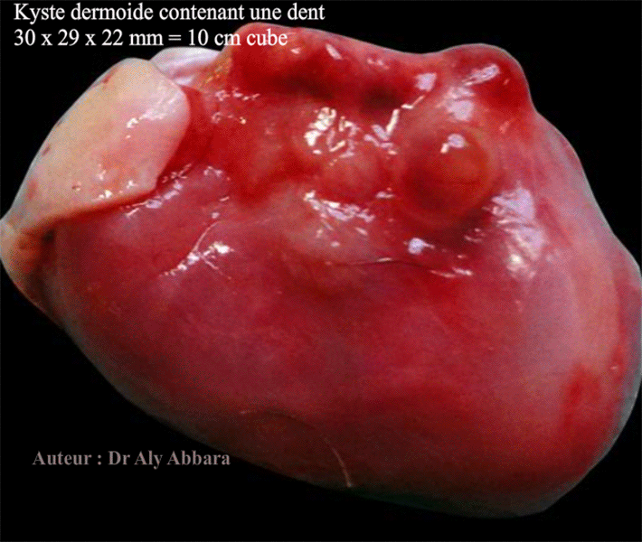 L'aspect échographique et l'aspect macroscopique d'un tératome bénin (kyste dermoïde) de l'ovaire droit mesurant (30 x 29 x 22 mm, soit 10 cm3) contenant outre des poils et du sébum, une dent (incisive parfaitement formée). Auteur : Dr Aly Abbara Mise à jour : le 1 Décembre, 2020 |
