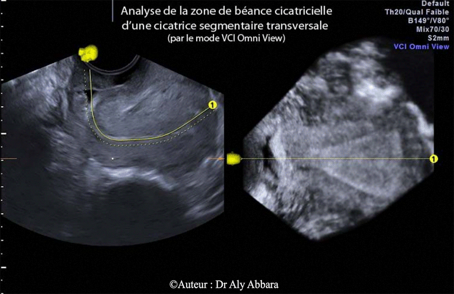 | Cicatrice d'une césarienne segmentaire transversale identifiable par l'échographie 3D, mode "Omni view" ; ce mode permet d'explorer cette cicatrice dans un plan frontal tout en analysant la forme de l'utérus et de la cavité utérine. Il s'agit d'une cicatrice béante et prenant, sur la coupe frontale la forme d'une fissure profonde et étendue sur toute la largeur de la paroi antérieure de l'isthme utérin. Depuis 1994, cette anomalie de la cicatrisation de l'hystérotomie de la césarienne segmentaire transversale fut appelée "Isthmocèle". En échographie 3D, mode "Triplan", la cicatrice peut être analysée sur trois coupes (sagittale, transversale et frontale). En échographie 2D, cette zone de béance (rupture de continuité) prend la forme d'une goutte d'eau (vessie pleine) ou d'un triangle (vessie vide). Consulter cet article sur l'aspect échographique de la cicatrice de la césarienne. |
