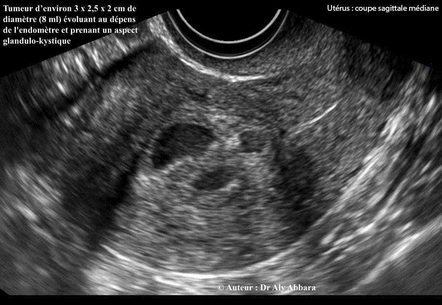 Images échographiques montrant une formation ovoïde évoluant au dépens de l'endomètre et prenant le forme d'une tumeur (polype) mesurant 26,6 x 19,8 x 29,1 mm (soit 8 cm3) ; elle est composée de multiples micro logettes tapissées par un revêtement et séparées par des cloisons parcourues par des micro-vaisseaux sanguines (aspect glandulo-kystique).