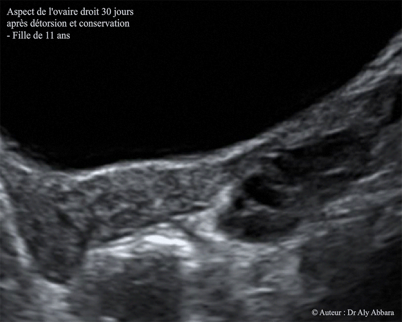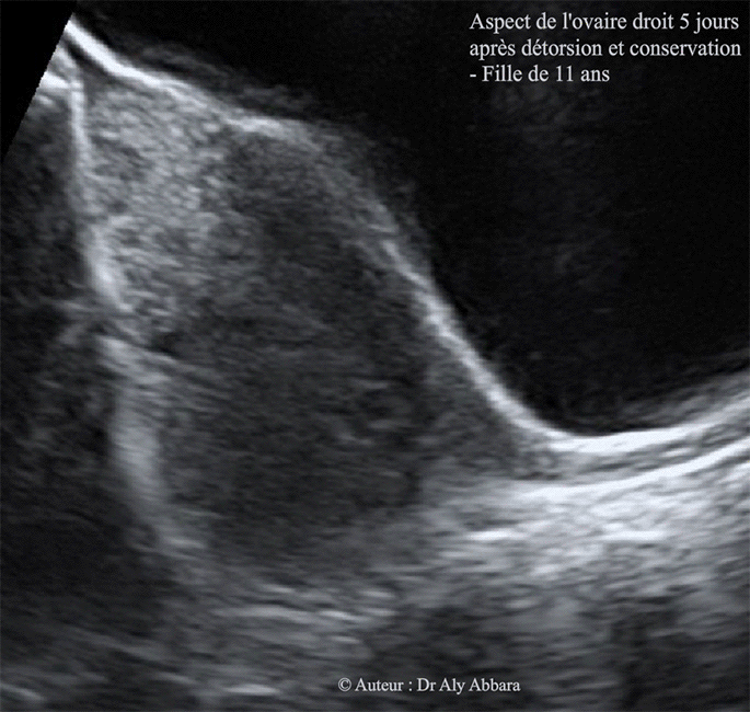 L'image échographique montre un ovaire droit augmenté de volume (73 cm3 contre 8 cm3 qui est le volume de l'ovaire gauche non tordu). On observe la présence des follicules antraux (de 2 à 5 mm de diamètre) dispersés au sein de cet ovaire et séparés par un stroma ovarien œdémateux et infiltré (cliniquement par le sang) et fort probablement nécrobiosé par une ischémie (silence Doppler couleur) due l'obturation mécanique des vaisseaux vascularisant normalement les annexes utérines (torsion de 720° à l'inverse des aiguilles de montre : du ligament utéro-ovarien ; du ligament large et du ligament lombo-ovarien droits).