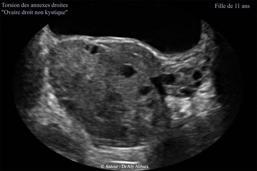 Images échographiques montrant une torsion des annexes utérines droites chez une fille de 11 ans (non encore réglée : pas de ménarche) - ovaire droit non kystique.
