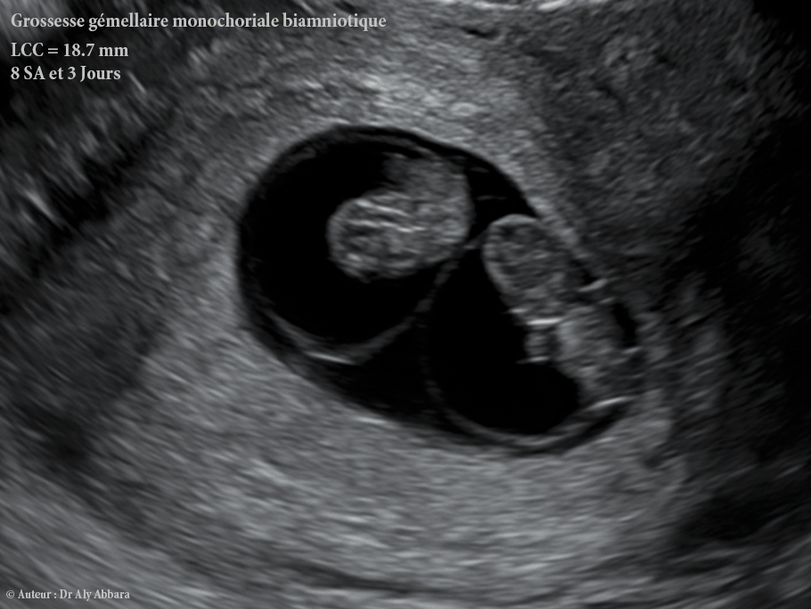 Grossesse gémellaire évolutive monozygote (vrais jumeaux), monochoriale bi-amniotique à 8 SA + 3 jours (LCC = 18,7 mm) :