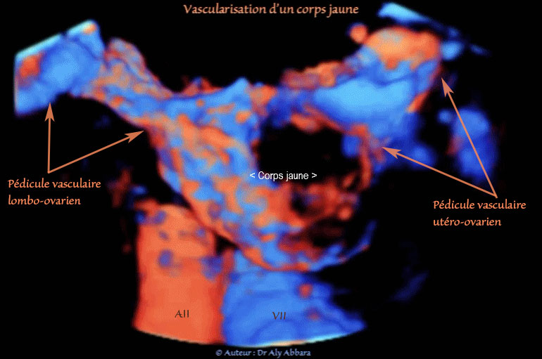 Vidéo et image échographiques en 3D montrant les caractéristiques de la vascularisation (analysée en mode Doppler Dynamic-Flow) d'un corps jaune dans l'ovaire droit :