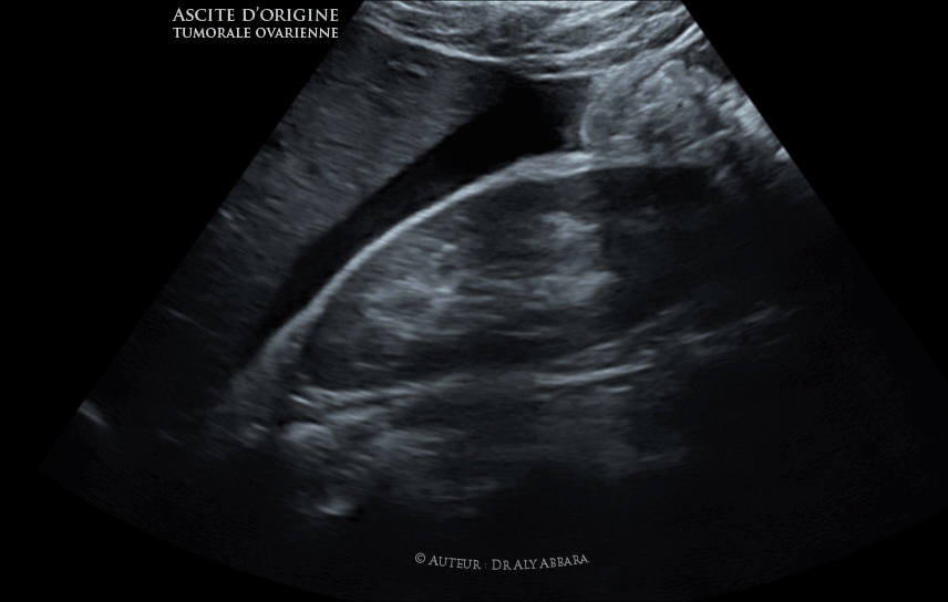 Séquences Vidéo et images échographiques mettant en évidence une ascite péritonéale d'origine tumorale ovarienne :