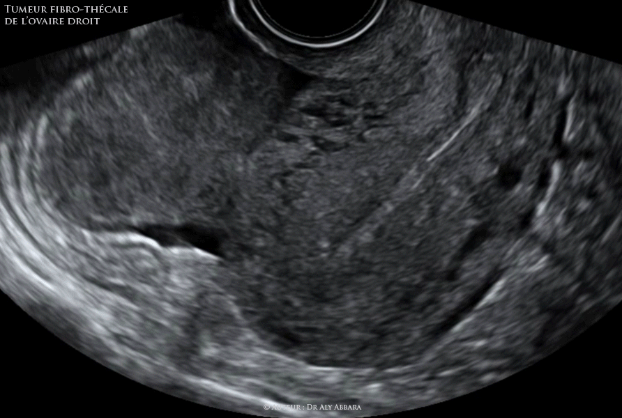 Séquences Vidéo et images échographiques mettant en évidence la présence d'une tumeur ovarienne droite, solide, mesurant 36 x 49 x 81 mm (environ 74 cm3), mobile, bien vascularisée (par l'analyse des signaux du Doppler couleur) et associée à la présence d'une ascite modérée seulement pelvienne.