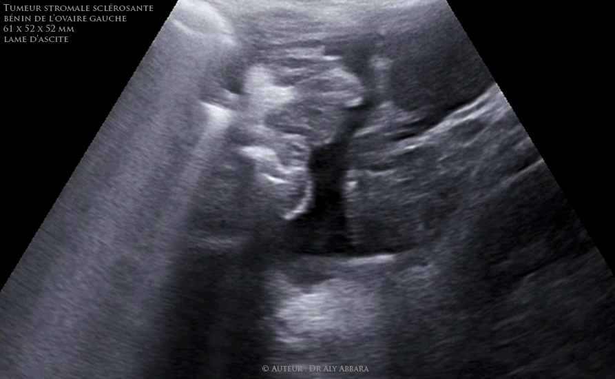 Séquences Vidéo et images échographiques puis cliniques mettant en évidence la présence d'une tumeur ovarienne gauche, solide, bénigne, stromale sclérosante, chez une adolescente de 16 ans.