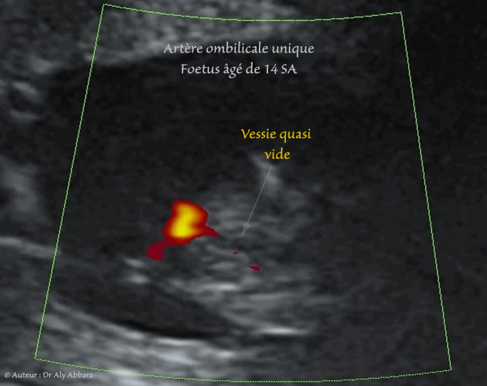 Le diagnostic échographique est possible par la réalisation d'une coupe transversale sur le cordon ; l'utilisation du Doppler couleur facilite ce diagnostic. Pour déterminer le côté de l'artère absente, il faut réaliser une coupe transversale au niveau de la vessie, sur cette coupe, le Doppler couleur met en évidence l'artère ombilicale manquante.