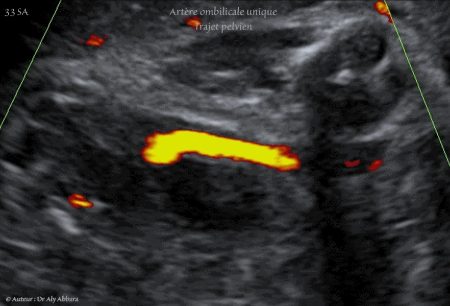 - Image échographique animée montrant, grâce au Doppler couleur de type Dynamic-Flow, la présence d'une artère ombilicale unique (AOU) dans sa portion pelvienne, coiffant la vessie après sa naissance de l'artère iliaque interne, puis atteignant en avant de la vessie l'ombilic, puis le cordon ombilical.