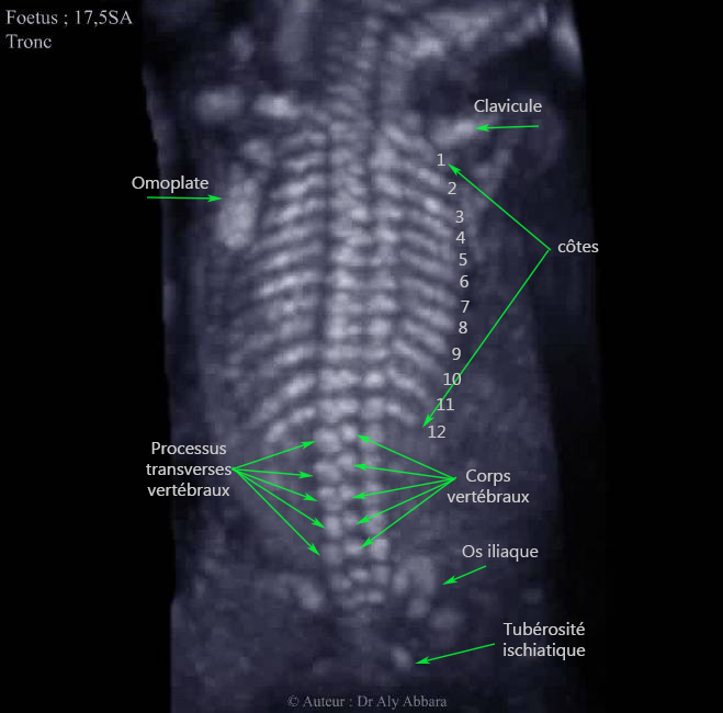 Images échographiques en 3D (os) animées montrant les éléments osseux squelettiques du tronc identifiables par échographie chez un fœtus âgé de 17 SA et 4 jours.