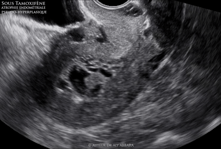 Utérus : l'aspect échographique d'une atrophie endométriale pseudo-hyperplasique asymptomatique chez une patiente âgée de 81 ans traitée par tamoxifène depuis presque 5 ans.