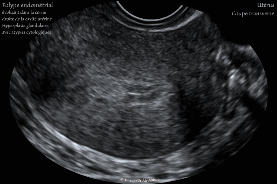 La ligne de vacuité utérine présente une solution de continuité au niveau du site de l'insertion du polype endométrial qui paraît comme une formation ovoïde plus échogène que l'endomètre juxtaposé.