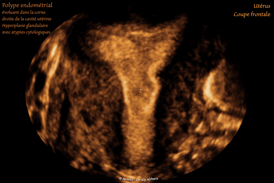 • Images échographiques montrant (sur une coupe frontale, puis des coupes para-sagittale droite et transverse) la présence au fond utérin, dans la corne droite, la présence d'une formation polypoïde mesurant 14 x 9 x 8,4 mm (soit 0,6 cm3).