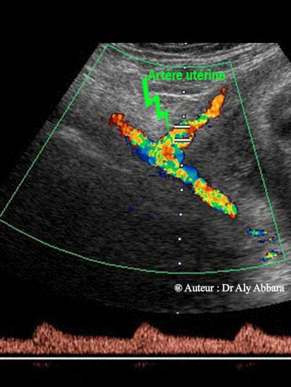 Image comparant l'aspect du spectre normal de l'artère utérine droite immédiatement après son croisement avec l'artère iliaque externe droite et spectre cette dernière.