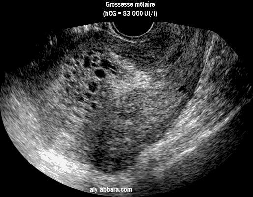Image échographique montrant une coupe sagittale d'un utérus contenant une grossesse môlaire avec l'aspect vésiculaire typique de la môle On remarque bien l'absence de structures embryonnaires ou préplacentaires reconnaisables