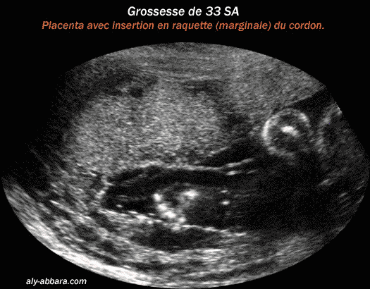 Placenta d'une grossesse à 33 semaines d'aménorrhée avec insertion marginale (ou en raquette)