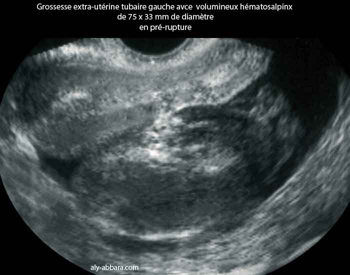 Grossesse extra-utérine tubaire : hématosalpinx volumineux en pré-rupture Grossesse de 5 semaines d'aménorrhée. |