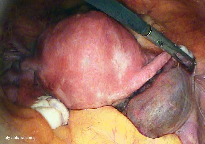 Image pelvienne per-coelioscopique montrant les organes génitaux internes de la femme avec la présence, à la portion moyenne et distale de trompe droite d'une grossesse extra-utérine tubaire non rompue adhérant à au feuillet postérieur du ligament large droit. À l'échographie, cette trompe est porteuse d'un sac gestationnel avec un embryon de 12 mm de longueur crânio-caudale (7 semaines d'aménorrhée et 3 Jour) avec une activité cardiaque bien présente, taux de hCG plasmatique est de 62 000 UI/L. |