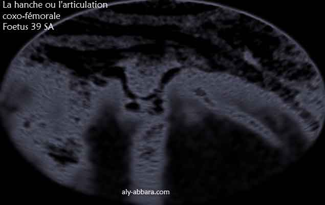 Image échographique en négatif montrant les éléments anatomiques composant la hanche ou l'articulation coxo-fémurale (la tête de la fémur et la cavité de l'acétabulum "acétabule").