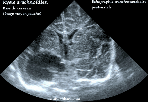 Auto-diaporama d'images échographiques transformationnelles du cerveau d'un nouveau-né montrant la présence d'un volumineux kyste arachnoïdien évoluant au niveau de la base du cerveau, à l'étage moyen avec refoulement du thalamus homolatéral vers le haut. L'ensemble des images montre aussi l'absence de dilatation du système ventriculaire cérébral. Il s'agit d'une anomalie isolée avec par ailleurs une morphologie et un caryotype fœtaux parfaitement normaux. |