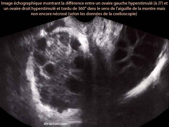 - En comparant l'ovaire droit tordu, à l'ovaire gauche non tordu, on peut constater de la présence d'un œdème infiltrant la totalité des structures ovariennes et entraînant l'aspect échographique de l'épaississement du cortex (albuginée) de l'ovaire tordu et de son stroma .