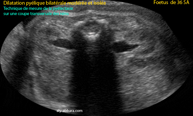 Dilatation pyélique bilatérale (pyélectasie) et modérée Fœtus âgé de 36 SA |